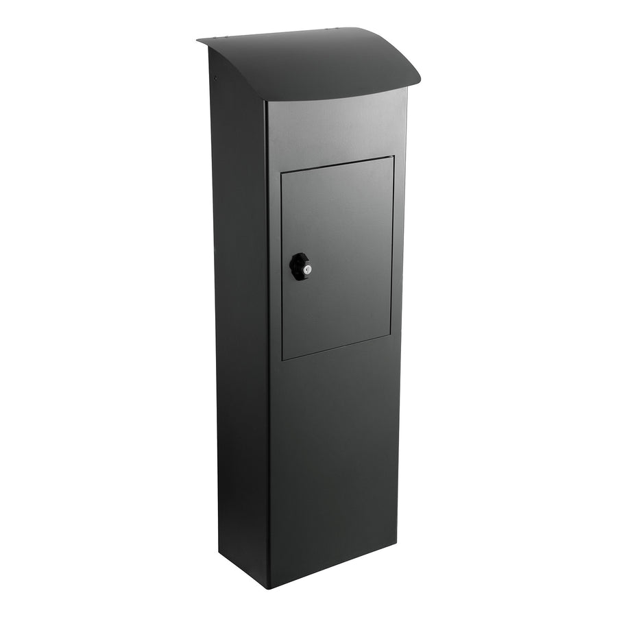 Winfield ParcelSentry locking top loading freestanding parcel mailbox features a curved soft closing lid which covers incoming parcel drop opening. Lid is raised up and a steel plate lifts inside with lid, then parcel is placed though top and drops into locking compartment when lid is closed keeping contents safe from unwanted hands. Build from thick heavy gauge galvanized steel, parcel box has a tough black powder coat finish. Locking retrieval door is fitted with a butterfly lock and comes with a set of keys.