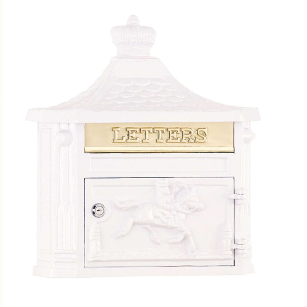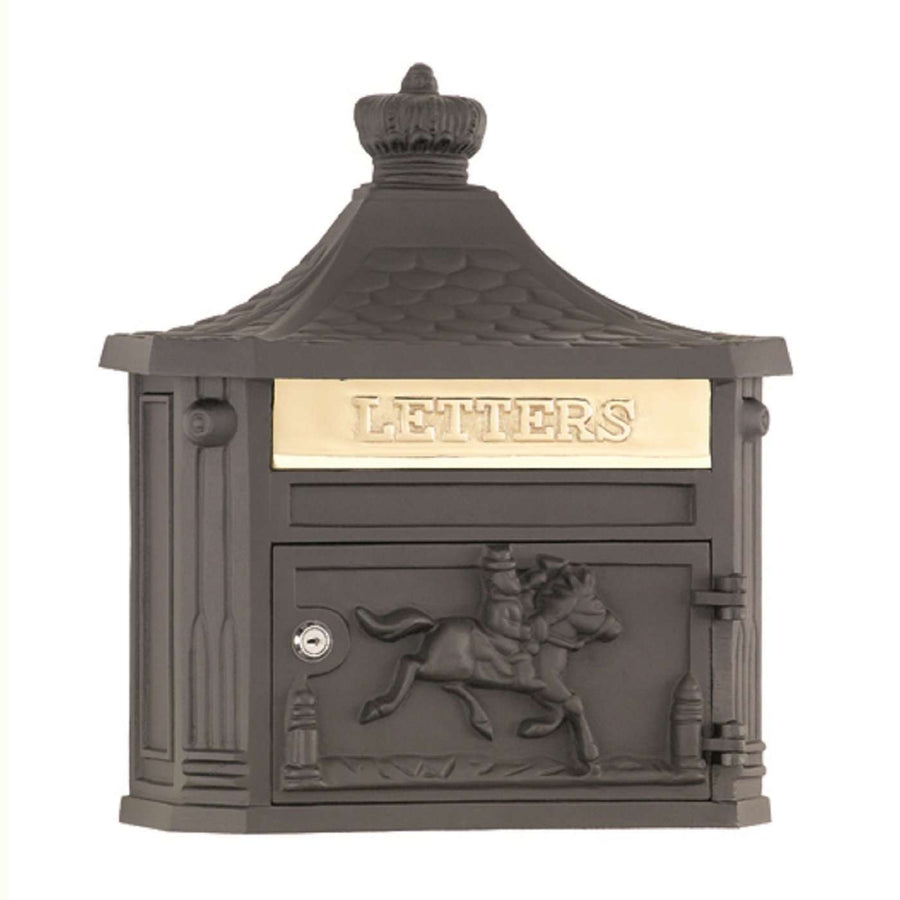 Made of 100% heavy-duty cast-aluminum in lightweight construction. The pony express image adds historic quality to this mailbox that also features security locking on the front door and a solid brass mail flap with an opening. Each mailbox comes with four keys. Mounting hardware not included.